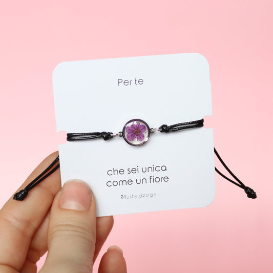 Bracciale regolabile in cordoncino e ciondolo in acciaio inox con fiore selvatico viola intersecata nella resina
