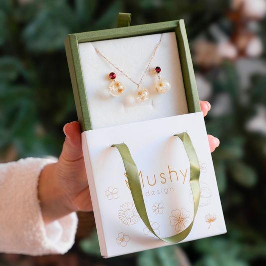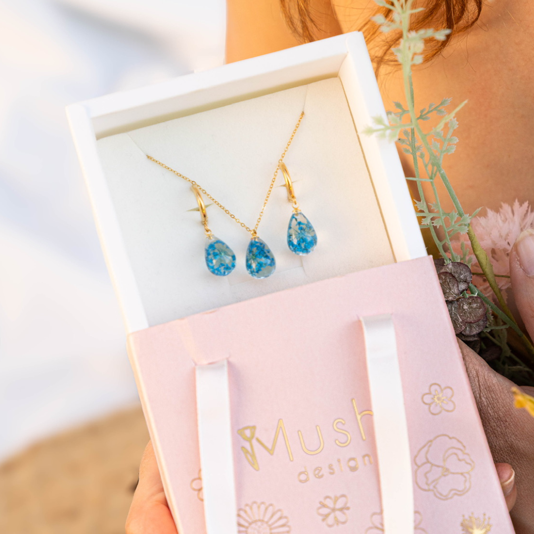 Parure collana + orecchini + bracciale in acciaio inossidabile e ciondolo in resina con Nontiscordardimé