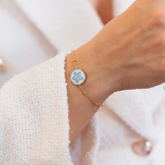 Bracciale in acciaio inox e ciondolo medaglione in resina con fiore vero Nontiscordardimé