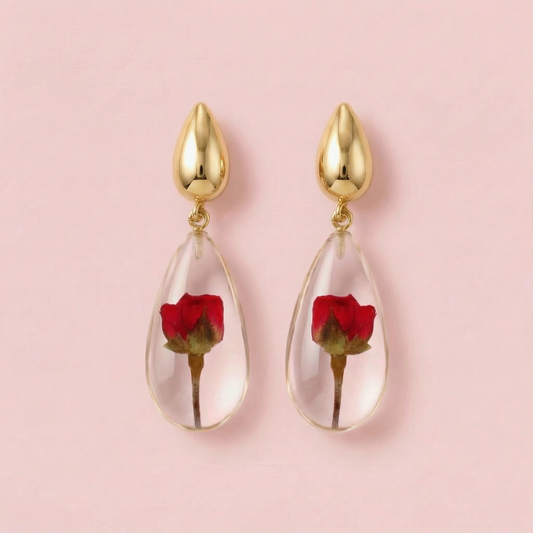 Orecchini Pendenti in Resina con Fiori Veri di Rosa rossa - RUGIADA, Acciaio Inox