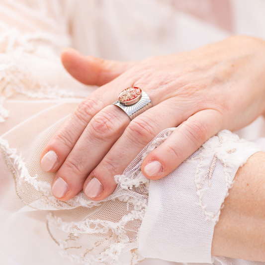 Anello SEMI in acciaio inox e Pizzo della regina Anna rosso intersecata nella resina