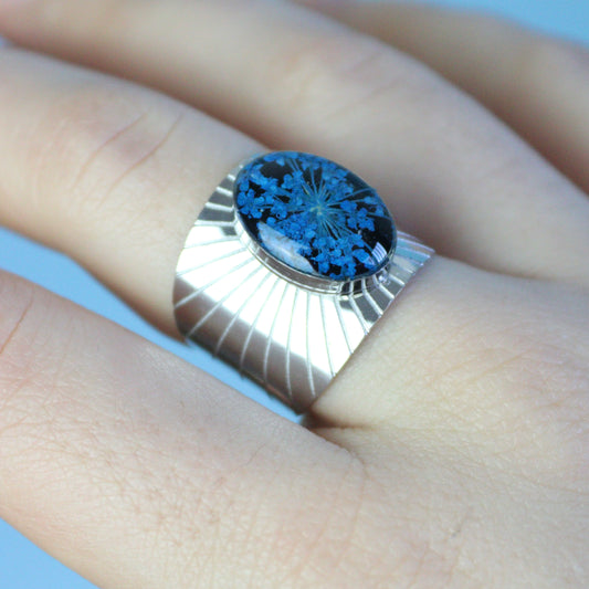 Anello regolabile in acciaio inox e Pizzo della regina Anna blu inglobato nella resina