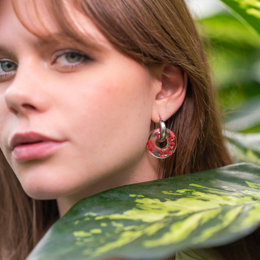 Paio di orecchini BLOOM in acciaio inossidabile e resina con Pizzo della regina Anna rosso