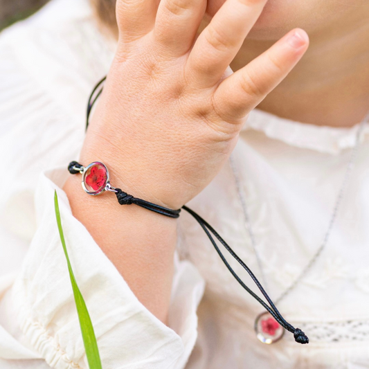 Bracciale regolabile in cordoncino e ciondolo in acciaio inox con Spirea rosso intersecata nella resina