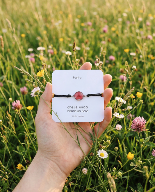 Bracciale ABBRACCIAMI in acciaio inox con resina e fiore selvatico rosa