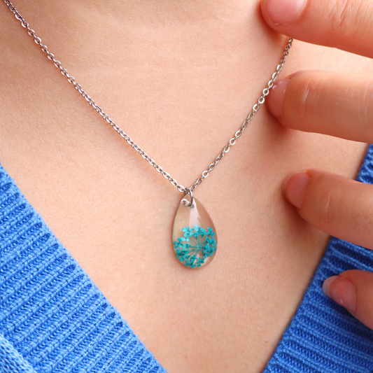 Collana goccia in acciaio inossidabile e ciondolo in resina con Pizzo della regina Anna turchese