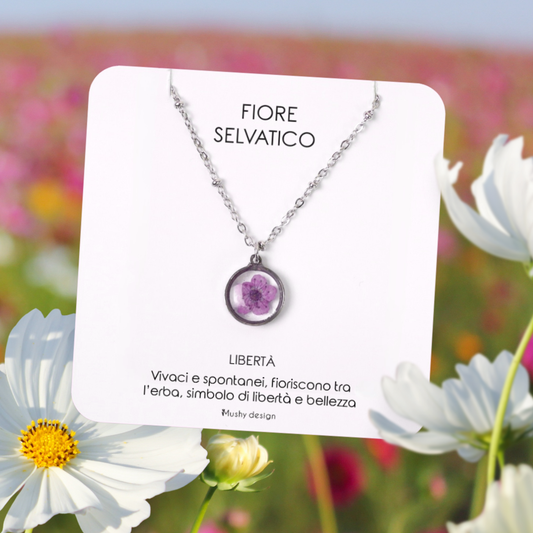 Collana in acciaio inossidabile e ciondolo in resina con fiore selvatico viola