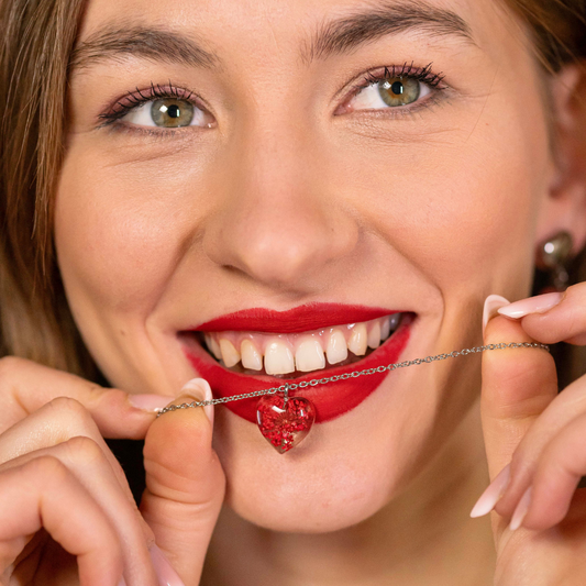 Collana cuore in resina con fiore Pizzo della regina Anna rosso e montatura in acciaio inox