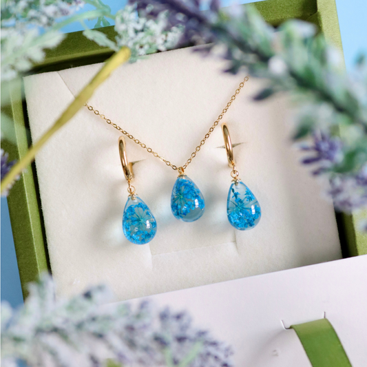 Parure Rugiada collana + orecchini in acciaio inossidabile e ciondolo in resina con Pizzo della regina Anna blu