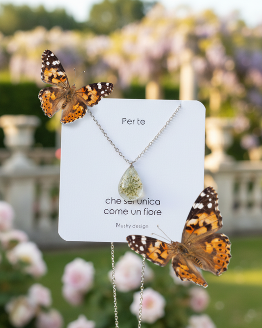 Collana RUGIADA in acciaio inossidabile e ciondolo in resina con Glixia bianca e Carota selvatica