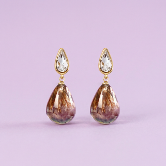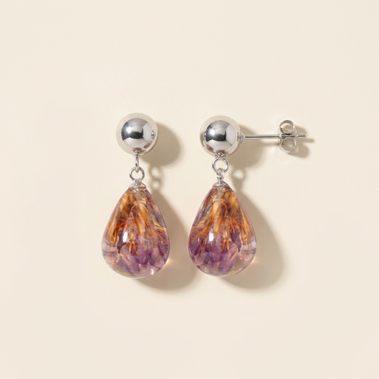 Orecchini Pendenti in Resina con Fiori Veri di Statice viola - RUGIADA, Acciaio Inox