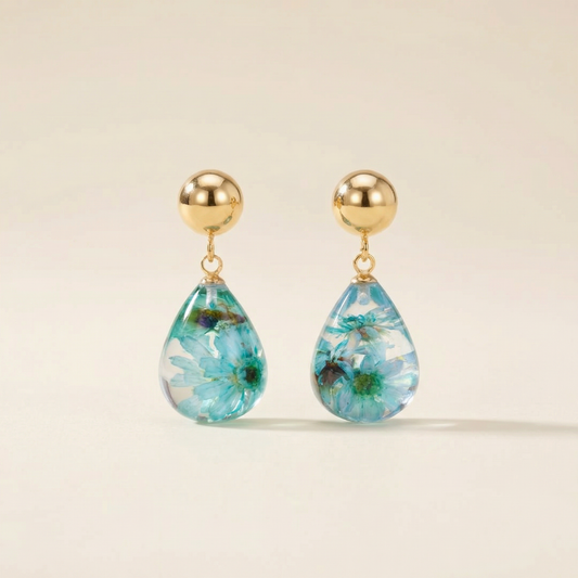 Orecchini Pendenti in Resina con Fiori Veri di Glixia verde - RUGIADA, Acciaio Inox