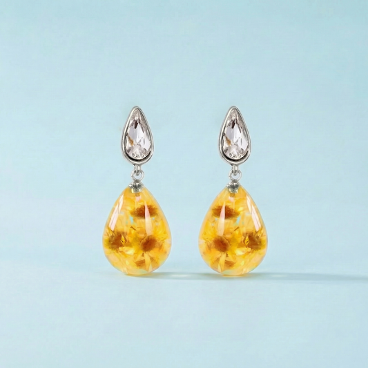Orecchini Pendenti in Resina con Fiori Veri di Glixia gialla - RUGIADA, Acciaio Inox