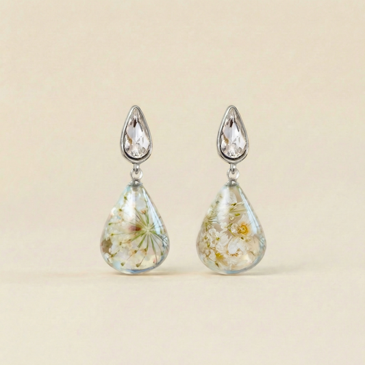 Orecchini Pendenti in Resina con Fiori Veri di Glixia bianca e Pizzo della regina Anna - RUGIADA, Acciaio Inox