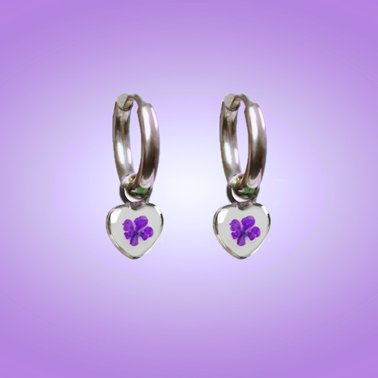 Orecchini a cerchio piccoli in acciaio inox con ciondolo a cuore e Pizzo della regina Anna viola