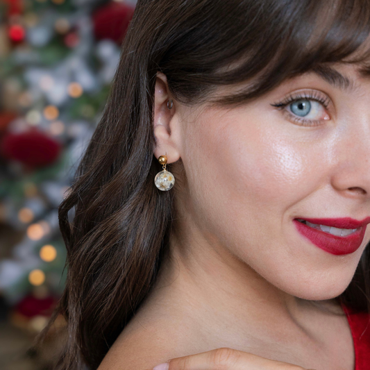 Paio di orecchini MINI BOLLE - sfere pendenti con fiore vero Glixia bianco e montatura acciaio inox