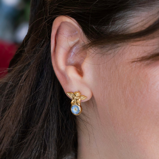 Orecchini BOLLE in acciaio inox oro, zircone azzurro, con resina e Pizzo della regina Anna bianco