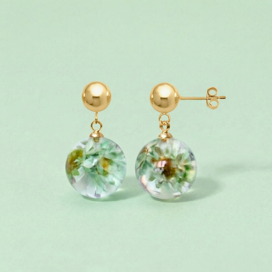 Orecchini Pendenti in Resina con Fiori Veri di Glixia verde - RUGIADA, Acciaio Inox