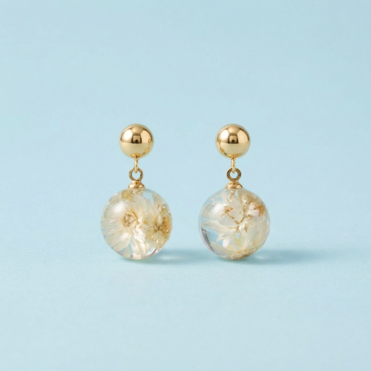 Orecchini Pendenti in Resina con Fiori Veri di Carota selvatica e Glixia bianca - RUGIADA, Acciaio Inox