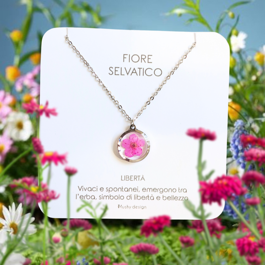 Collana in acciaio inossidabile e ciondolo in resina con fiore selvatico fucsia