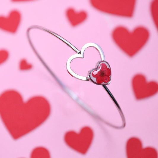 Bracciale rigido cuore in acciaio inox fiore selvatico rosso sotto resina - collezione ABBRACCIAMI