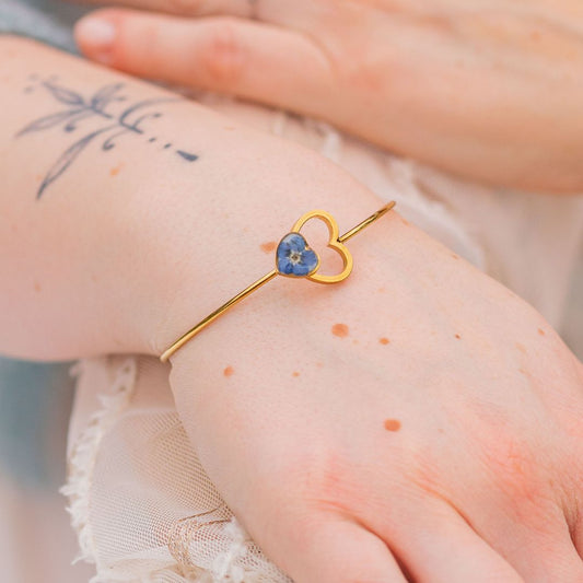 Bracciale rigido cuore in acciaio inox fiore selvatico blu sotto resina - collezione ABBRACCIAMI