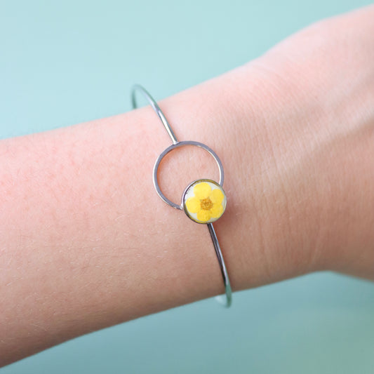 Bracciale ABBRACCIAMI in acciaio inox con resina e fiore selvatico giallo