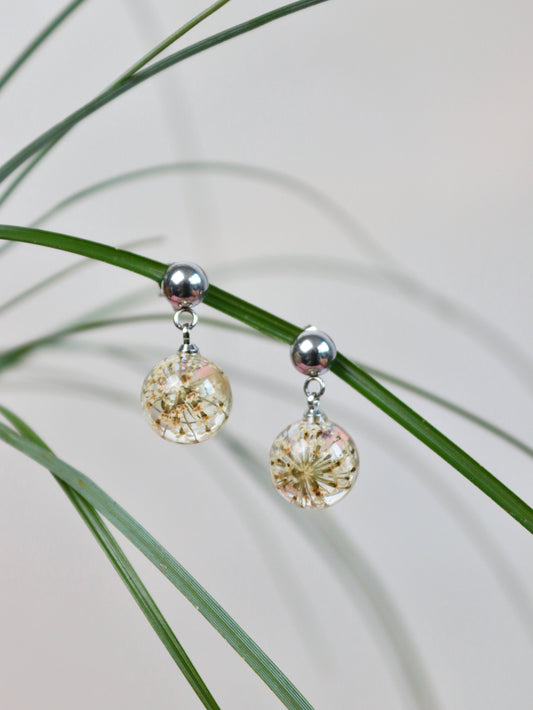 Paio di orecchini BOLLE - sfere pendenti con fiore vero Pizzo della regina Anna bianco e montatura acciaio inox
