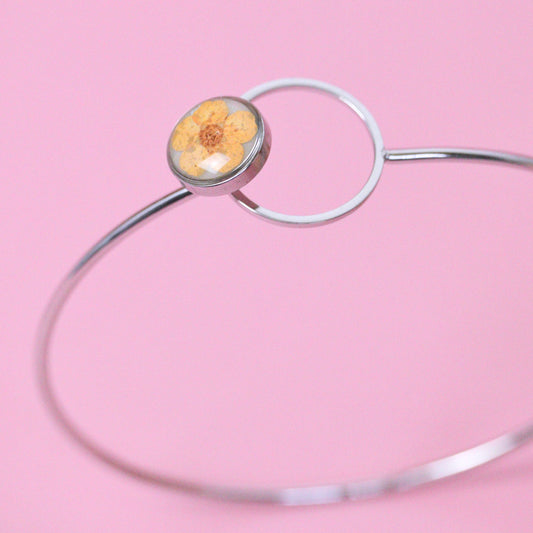 Bracciale rigido cuore in acciaio inox fiore selvatico arancio sotto resina - collezione ABBRACCIAMI