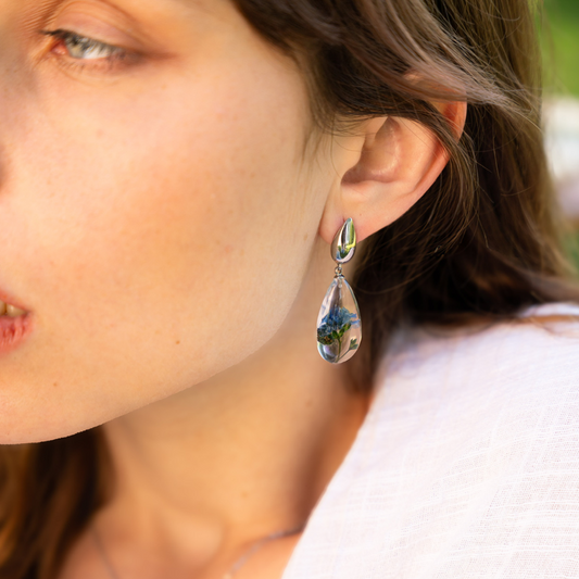 Orecchini Pendenti in Resina con Fiori Veri di Nontiscordardimé - RUGIADA, Acciaio Inox