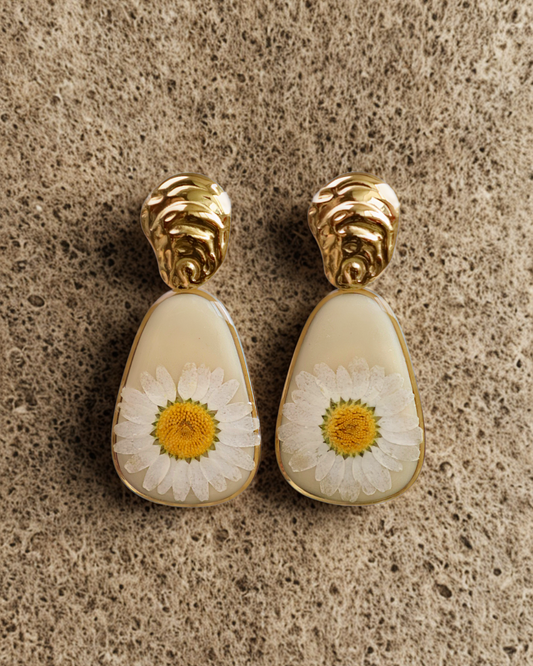 Orecchini Pendenti in Resina con Fiori Veri di Margherita - Acciaio Inox anallergico dorato