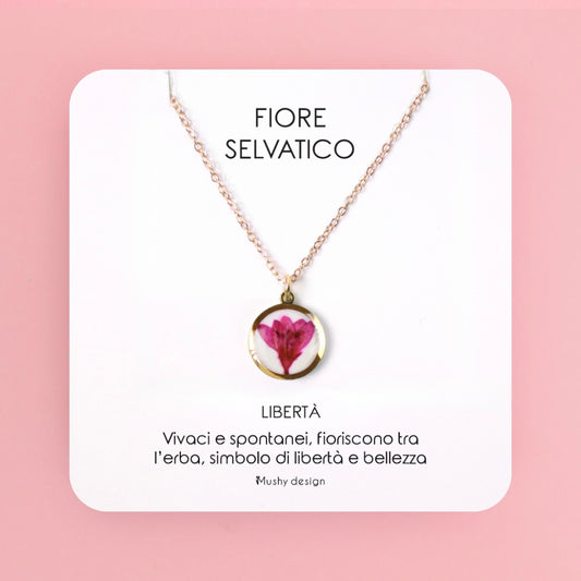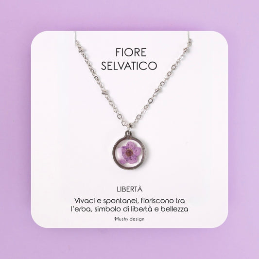 Collana in acciaio inossidabile e ciondolo in resina con fiore selvatico viola