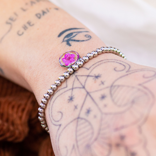 Bracciale elastico in acciaio inossidabile e ciondolo in resina con Lysamachia