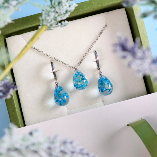 Parure Rugiada collana + orecchini in acciaio inossidabile e ciondolo in resina con Pizzo della regina Anna blu