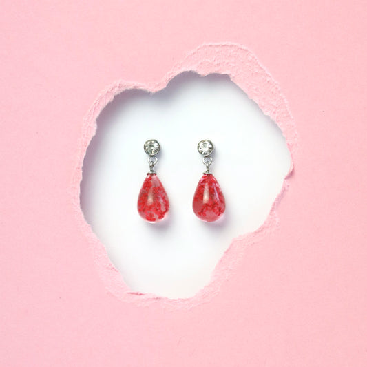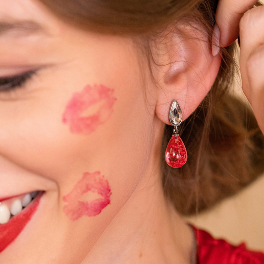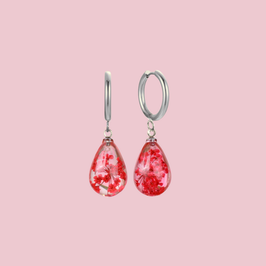 Orecchini Pendenti in Resina con Fiori Veri di Pizzo della Regina Anna Rosso - RUGIADA, Acciaio Inox