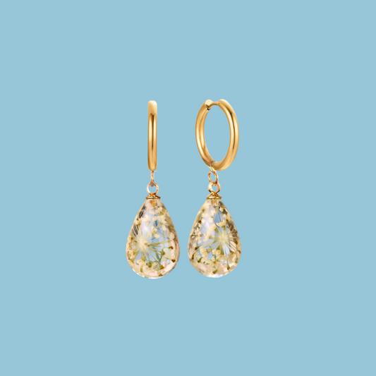 Orecchini Pendenti in Resina con Fiori Veri di Pizzo della Regina Anna bianco - RUGIADA, Acciaio Inox
