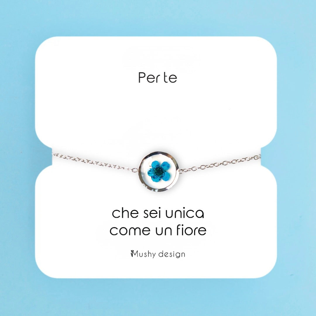 Bracciale in acciaio inox con ciondolo in resina e Fiore Selvatico blu
