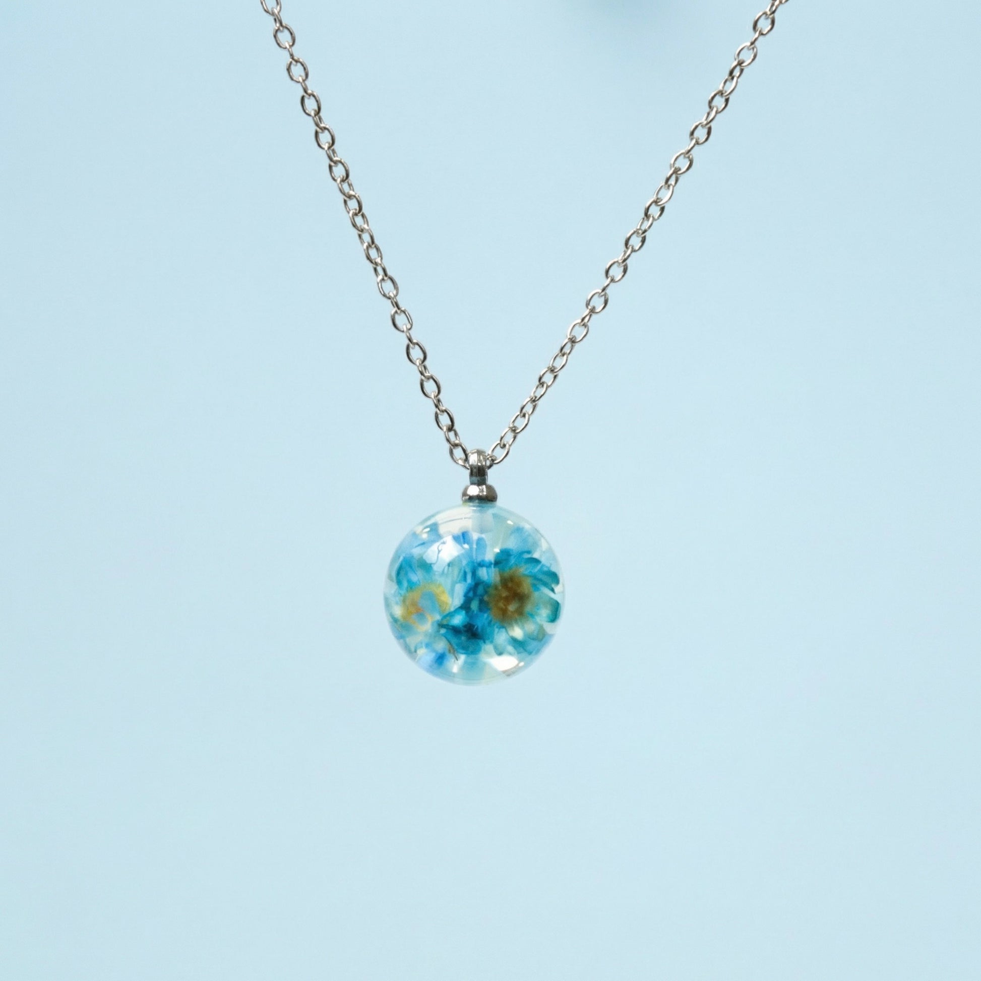 Collana BOLLA in acciaio inox con sfera in resina e fiori di Glixia blu
