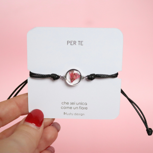 Bracciale regolabile in cordoncino e ciondolo in acciaio inox con Lysamachia intersecata nella resina