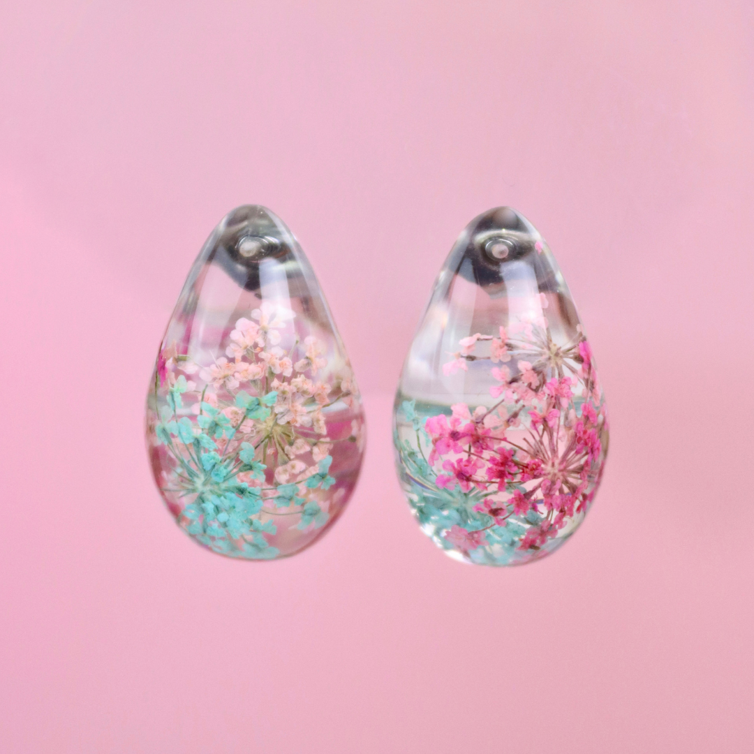 Orecchini a bottone a forma di goccia dupe in resina con fiori veri Pizzo della regina Anna rosa e azzurro