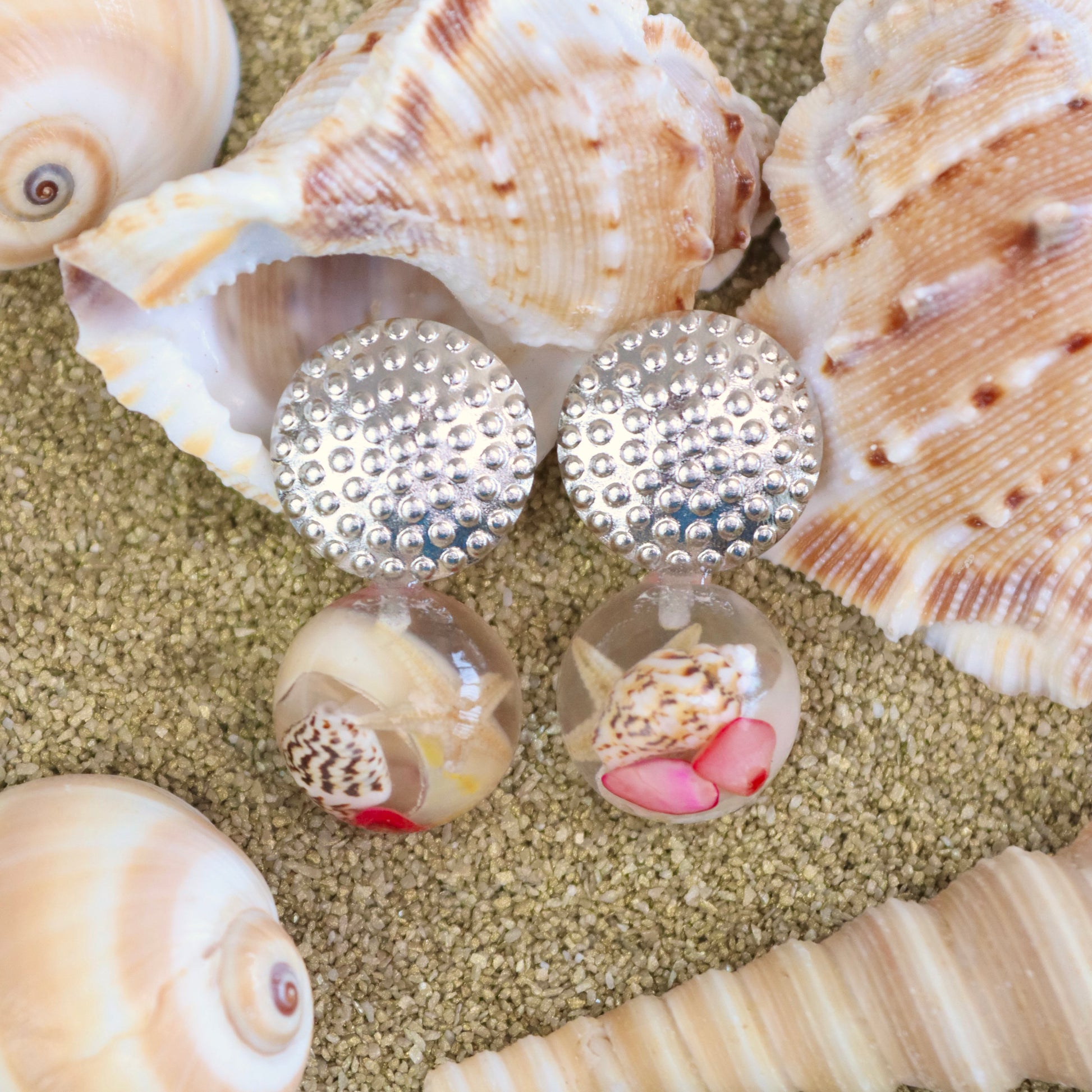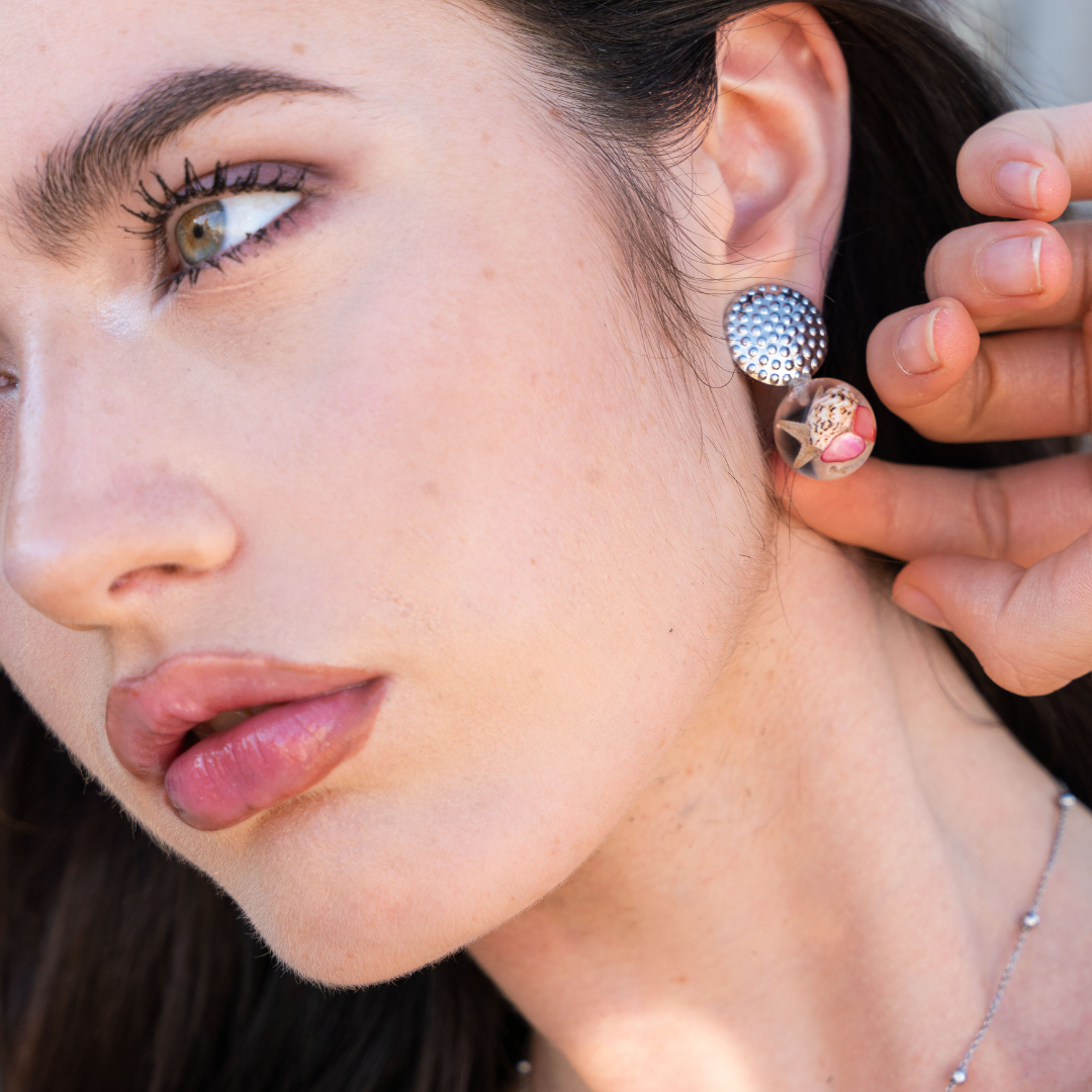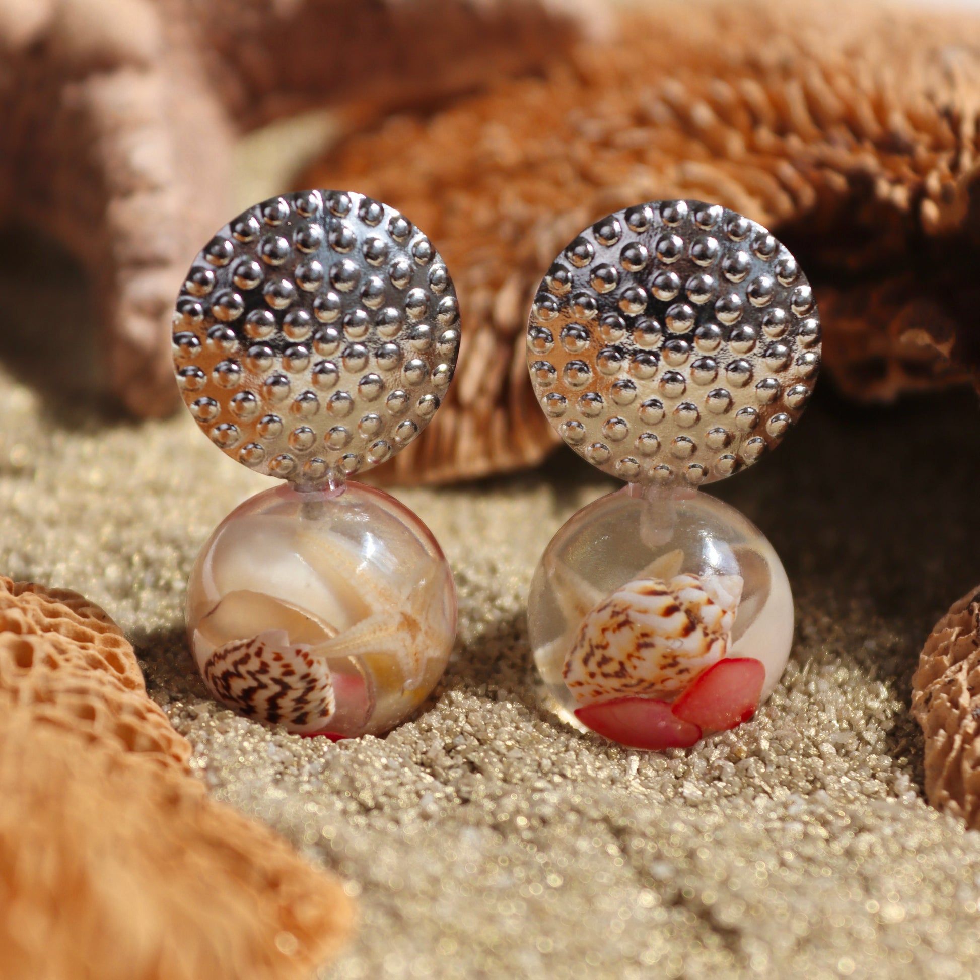 Orecchini BOLLA con Conchiglie vere e sassolini rossi in acciaio inossidabile anallergico