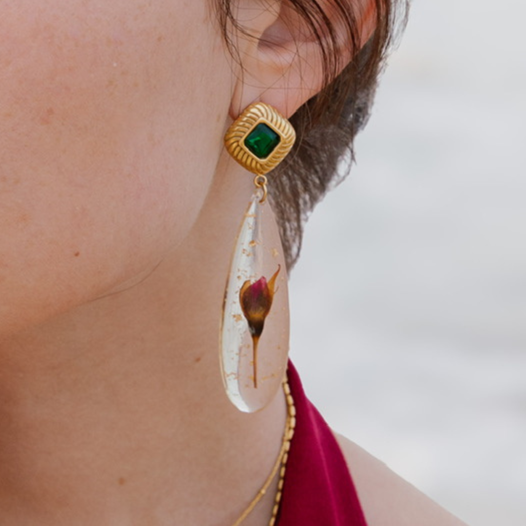 Orecchini in resina con fiori veri, progettati in Italia, sono realizzati in acciaio inox di alta qualità e rifiniti a mano con fiori veri incastonati nella resina epossidica.