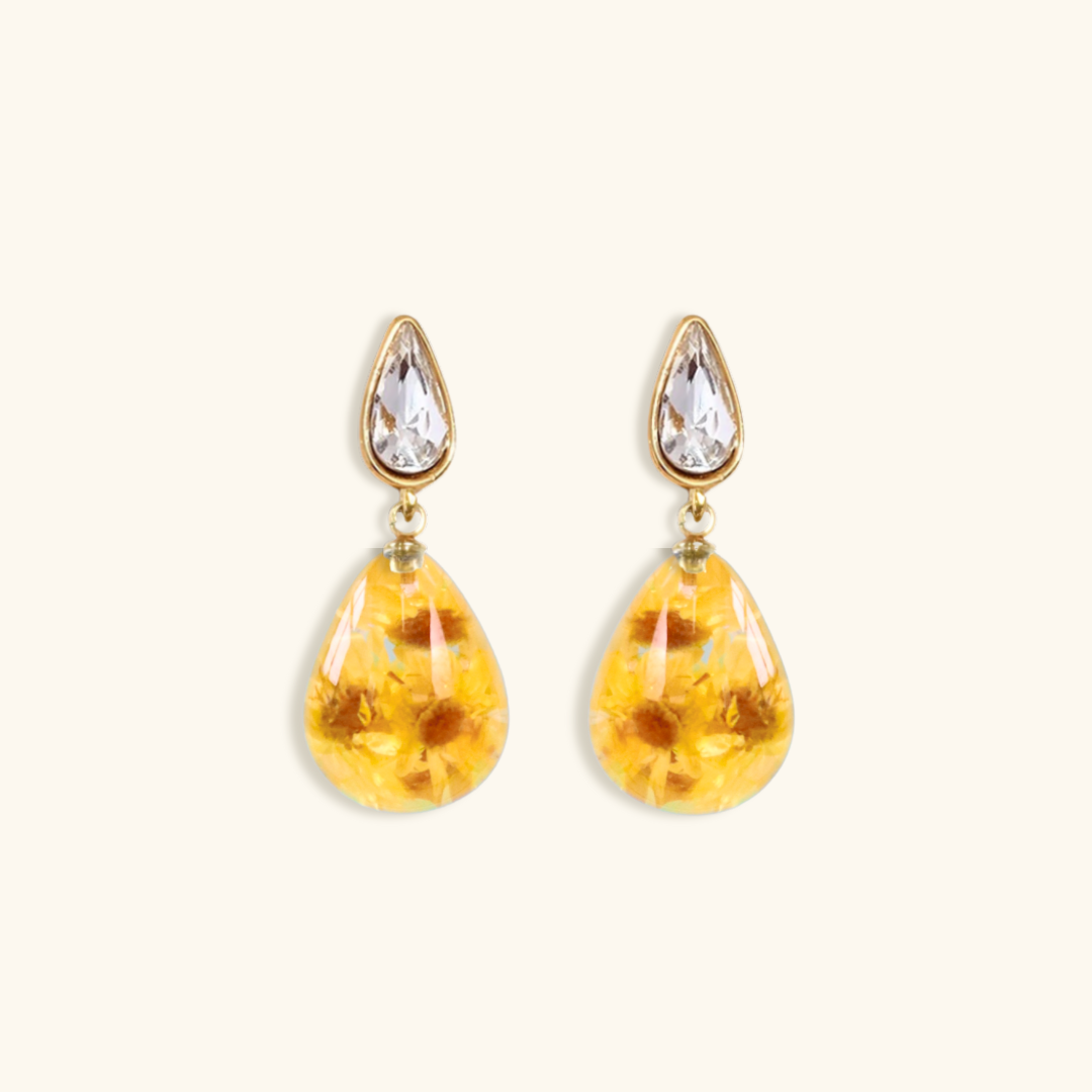 Orecchini Pendenti in Resina con Fiori Veri di Glixia gialla - RUGIADA, Acciaio Inox