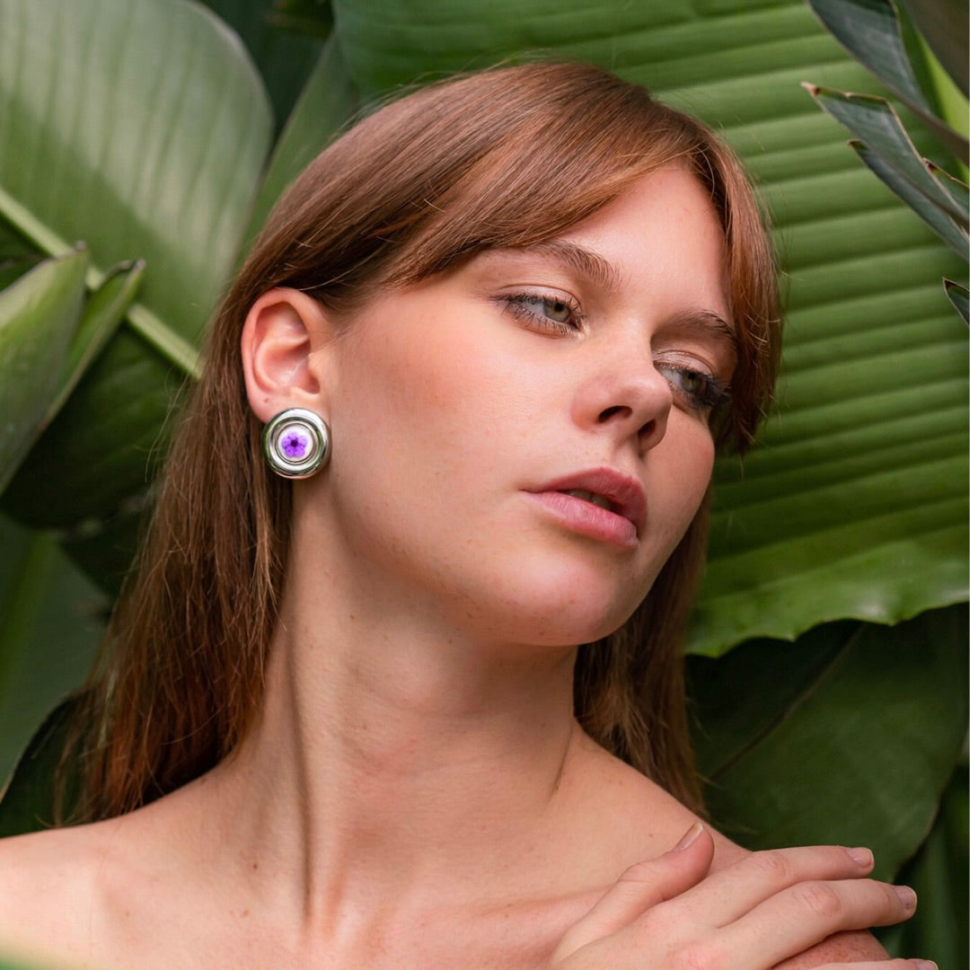 Orecchini a lobo SCUDO in acciaio inox con resina e fiore vero viola