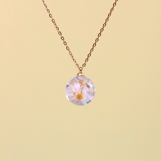 Collana BOLLA in acciaio inox con sfera in resina e fiori di Glixia bianca